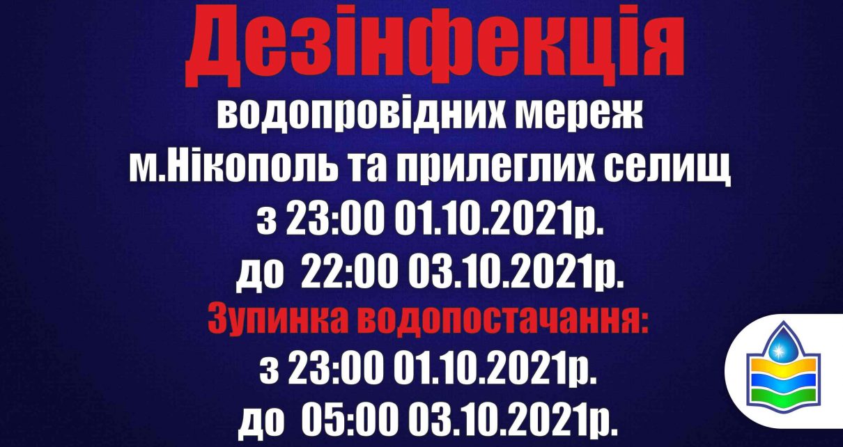 Увага! У період з 08:00 години 09 жовтня 2025 року до 08:00 години 11 жовтня 2025року, КП «НІКОПОЛЬВОДОКАНАЛ» проводитиме промивання та дезінфекцію на водопровідних мережах і спорудах міста, а також в
